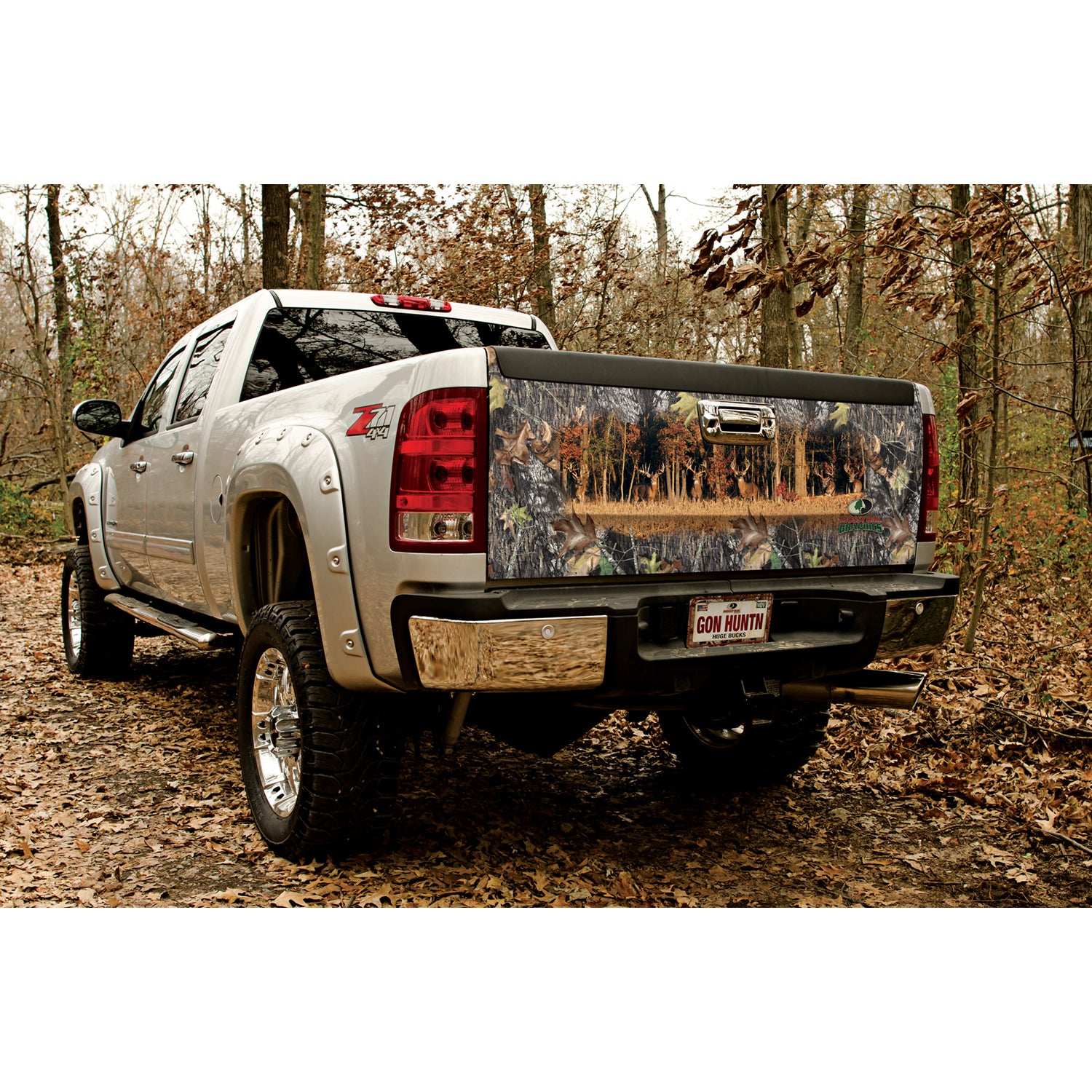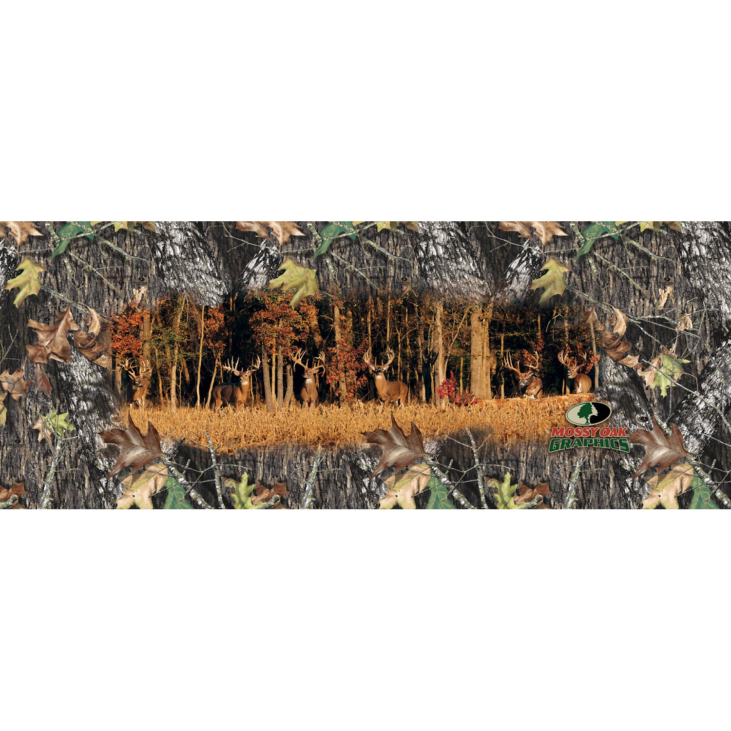 Tailgate graphic with Mossy Oak Break-up® and Six Monster Bucks. Two sizes available, 58" x 24" for a compact truck or 66" x 26" for a full size truck. Comes with matte finish.